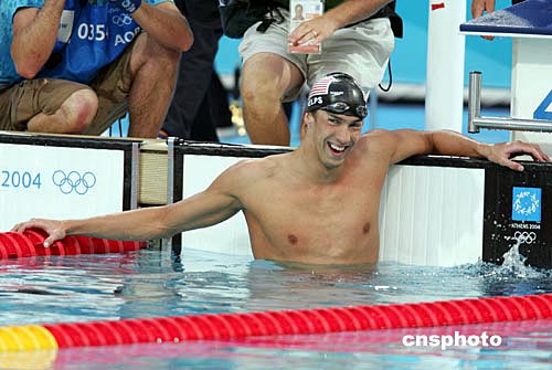 當(dāng)?shù)貢r(shí)間八月二十日晚,美國(guó)神童菲爾普斯在雅典奧運(yùn)男子一百米蝶泳比賽中獲得金牌。中新社記者:毛建軍