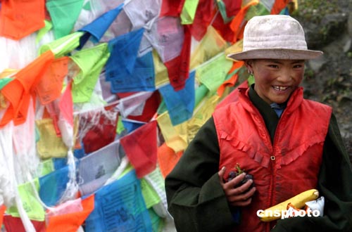 八月下旬,在四川省甘孜州海拔四千三百米的折多山上,一名藏族小姑娘和游客合影后得到新鮮水果作為回報。甘孜藏族自治州成立于一九五零年,是中國第一個專區級民族自治州。中新社記者:廖文靜