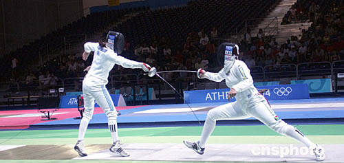 圖為在當?shù)貢r間8月20日舉行的女子擊劍比賽中,希臘選手和南非共和國選手展開激烈對攻。