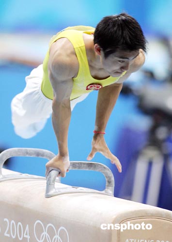 中新社雅典八月二十二日電 (記者 宋方燦)雅典奧運會體操鞍馬比賽今天晚上進行,中國兩名選手參加了比賽。滕海濱在比賽中發揮出自己的水平,以九點八三七分摘取金牌。