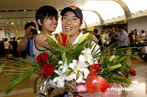8月23日,在雅典奧運會自行車女子500米計時賽中奪得銀牌的中國老將江永華(右)回到北京,在首都國際機場受到熱烈歡迎。中新社記者:盛佳鵬