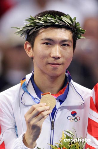 當地時間八月二十三日下午,韓國選手柳承敏在雅典奧運乒乓球男子單打決賽中以四比二戰勝中國選手王皓獲得金牌。中新社記者:毛建軍