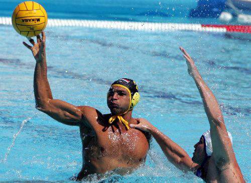 當(dāng)?shù)貢r(shí)間8月25日上午,雅典奧運(yùn)會(huì)男子水球比賽進(jìn)入白熱化階段,非洲冠軍埃及隊(duì)(黑帽)雖然竭盡全力防守和進(jìn)攻,但是由于實(shí)力差距較大而以1比12的懸殊比分負(fù)于克羅地亞隊(duì)。比賽中,一名克羅地亞隊(duì)員在對(duì)方門射門時(shí)用手強(qiáng)行按下對(duì)手肩膀,雖然被判犯規(guī),但阻止了對(duì)方一次頗有危險(xiǎn)的射門。 作者:任晨鳴