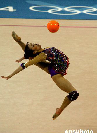 二○○二年釜山亞運會團體及個人全能冠軍鐘玲八月二十四日參加藝術體操賽前排練,她將代表中國隊出戰奧運會藝術體操個人全能比賽。中新社記者:王瑤