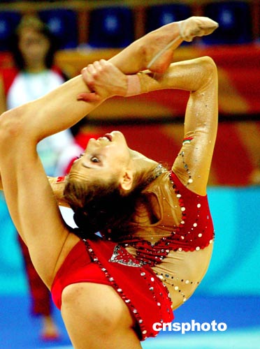 雅典當(dāng)?shù)貢r(shí)間八月二十五日,保加利亞藝術(shù)體操個(gè)人全能選手PAISIEVA進(jìn)行奧運(yùn)會(huì)賽前排練。中新社記者:王瑤