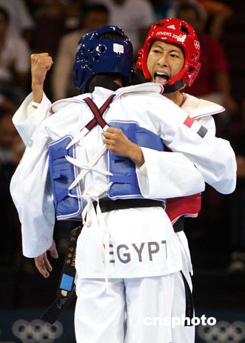 當地時間八月二十六日下午,在雅典奧運會男子五十八公斤級跆拳道比賽中,臺北選手朱木炎戰勝埃及選手殺入決賽。中新社記者:毛建軍
