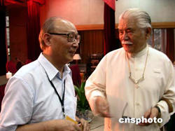 八月二十七日“黃賓虹國際學術研討會”在北京開幕。著名畫家邵大箴(左)與臺灣著名藝術家李奇茂(右)出席“黃賓虹國際學術研討會”。作者:王磊