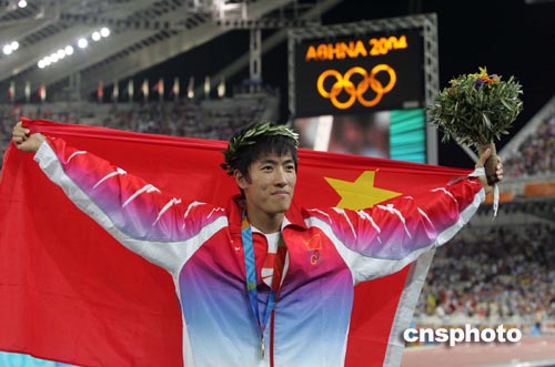 當地時間八月二十七日晚,在雅典奧運會男子一百一十米欄比賽中,中國選手劉翔以十二秒九一的成績獲得冠軍并打破奧運會紀錄。中新社記者:毛建軍