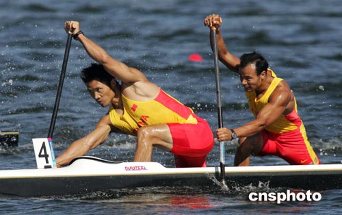 當地時間八月二十八日,中國選手孟關良、楊文軍在雅典奧運男子五百米雙人劃艇比賽中奪得金牌。中新社記者:毛建軍