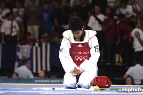 圖為男子跆拳道80公斤以上級冠軍韓國選手文大成為自己慶賀