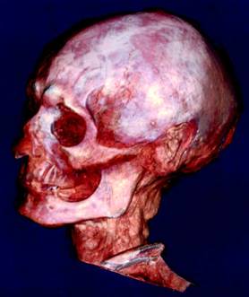 在實施木乃伊面容復原計劃時,由菲德瑞克博士領導的專家小組選中了一個3000歲的木乃伊。他生活在公元前945-前715年,生前是一個技術工人。該木乃伊于1900年在皇后谷地區被發掘出來,隨后又被送入埃及博物館。“手術”過程中,科學家們把木乃伊置于掃描儀上,以平均每27.4秒顯示335幀圖像的速度進行掃描。所有的圖像都被存入電腦的記憶系統中,最后使用特殊軟件在電腦中將裹尸布揭去。隨后,科學家們根據圖像數據,運用整形技術將頭骨復原。最后,他們以暴露在木乃伊裹尸布之外的面部皮膚和肌肉作為參照依據,用特殊材料制作成面部肌肉、耳朵、嘴巴等。