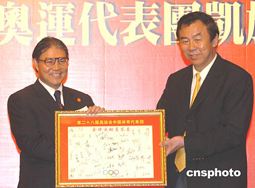 國家奧運金牌代表團團長袁偉民向中國香港體育協會暨奧林匹克委員會會長霍震霆致送紀念品。