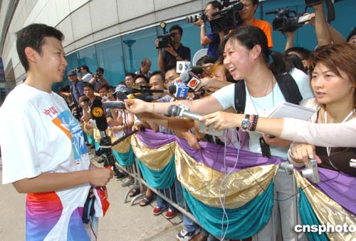 國家奧運金牌代表團9月7日在香港展開觀光之旅,9時45分抵達灣仔金紫荊廣場參觀,吸引大批市民圍觀,圖為女排隊長馮坤現場接受媒體采訪。作者:趙振清