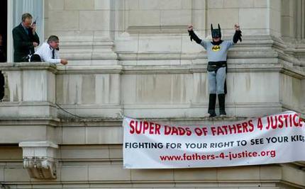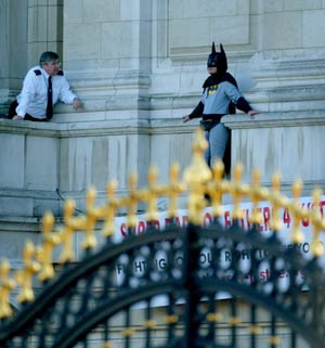 這名抗議者詹森·哈奇,今年32歲,是英國維護父權組織“為父親討公道(Fathers 4 Justice)”的一名成員,他扮成蝙蝠俠模樣,闖入女王伊麗莎白二世居住的白金漢宮,爬上宮殿正面一個陽臺,又從陽臺走到危險的墻檐上,引來大群圍觀者。大為尷尬的白金漢宮安全官員當天晚上即對此事展開調查。