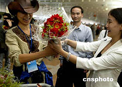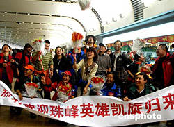 安利(中國)日用品公司員工,十六日晚在首都機場向“珠穆朗瑪峰環保大行動”順利返京的志愿者獻花祝賀,以表示對她們的敬佩。