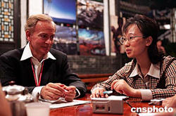 中法兩國(guó)文化交流日益密切。九月十七日,法國(guó)駐華大使館文化專員白尚化(左)在與中新社記者交談平遙國(guó)際攝影大展的所見(jiàn)所聞。作者:張?jiān)?