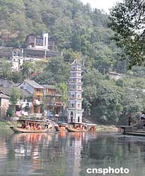 中國著名作家沈從文筆下清幽靈秀、碧波蕩漾的沱江穿梭在湘西鳳凰古城,流淌著鳳凰人祖祖輩輩的悲歡離合。正在舉行的湖南旅游節,吸引不少游客泛舟江上感受其魅力。作者:劉雙雙