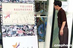 星光大道商店展示的中國奧運金牌選手簽名板,吸引游客駐足觀看。作者:洪少葵