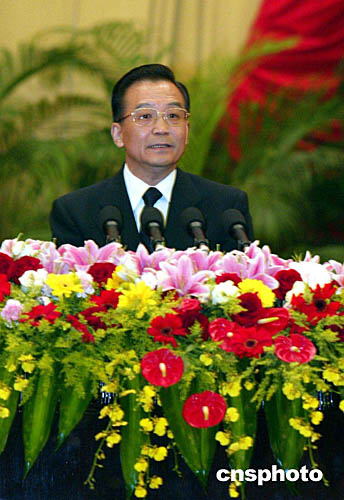 溫家寶總理在招待會上講話。他說,中國人民五十五年艱苦奮斗的光輝歷程,使我們從中得出一個最重要、最基本的結論,這就是:必須在中國共產黨的堅強領導下,立足中國國情,順應世界潮流,獨立自主地走中國特色的社會主義道路。