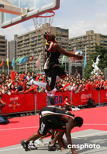 一批來自法國的灌籃高手在上!岸懔闼目煽诳蓸種BA嘉年華”開幕式上表演,吸引上海籃球迷觀賞。