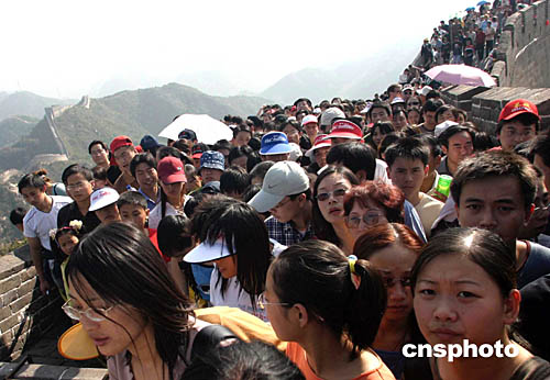 “十一”黃金周期間,大批游客擁擠在北京八達嶺長城上寸步難行。黃金周期間,北京故宮、八達嶺長城等景區接待游客連續多日呈飽和狀態。北京全市在整個黃金周共接待國內游客達406萬人次。中新社記者:張煒