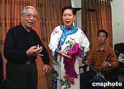 年過七旬臺灣人申陳曼麗女士(中),新近落戶上海,并在家中學京劇一絲不茍,“家教”老師是京劇大師梅蘭芳的入室弟子舒昌玉(左)。十月八日,申陳曼麗將在上海逸夫舞臺舉行自己的演出專場,上演梅派名劇、全本《玉堂春》。這位海外京劇名票粉墨登場,吸引上海眾多戲迷捧場。作者:潘索菲