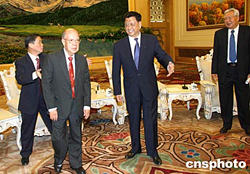 十月十二日在北京人民大會堂,全國政協常務副主席王忠禹(右二)、全國政協副主席羅豪才(右一)會見出席《紀念陳嘉庚先生誕辰130周年座談會》的陳嘉庚先生七子陳元濟等親屬。