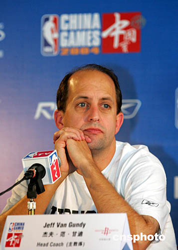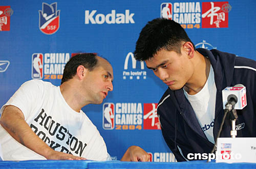 圖為在新聞發布會上,范甘迪不時與姚明“竊竊私語”進行交流。