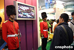 十月十四日,二零零四重慶秋季房地產展示交易會在重慶市展覽中心開幕。此次房交會共有二百一十家單位參展,參展項目一百七十三個,面積達九百二十七萬平方米。各商家在宣傳上也是各出奇招,招徠看房者。圖為一歐式樓盤展臺邊立著兩名英國禮兵,吸引不少市民目光。作者:郭晉嘉