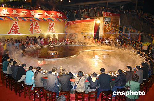 在有“天下第一大鍋”之稱的德莊大火鍋前,人頭攢動,熱鬧非凡,上千斤火鍋底料熬出的湯汁濃香撲鼻,讓人垂涎。重慶市人民政府副市長謝小軍在開鍋點火儀式上說,這天下第一大鍋有五十六個座位,象征著五十六個民族齊聚火鍋之都,品嘗這一山城美食。