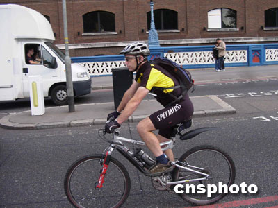 倫敦狹窄的馬路常常并不劃出專門的自行車道,即使有,只是用白線隔出的一條僅容一輛自行車騎行的細徑。也許是得益于這里良好的交通秩序和公眾的交通意識,人們騎車的速度一般都很快,堪稱“飆車”,雖然沒見到誰出現閃失,但其速度也令記者們暗暗捏一把汗。