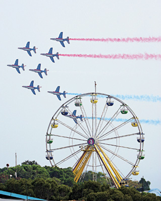 擔(dān)任特技表演的八架阿爾法戰(zhàn)機(jī),在港島海面上空排列出菱形、雁行、箭形及十字形等不同隊(duì)型,并不斷做出空中翻跟斗、急轉(zhuǎn)彎、突然分散及對(duì)飛等被人形容為“空中芭蕾”的連串高難度花式表演動(dòng)作。表演中飛機(jī)尾部噴灑出象征法國(guó)國(guó)旗的紅、白、藍(lán)三種彩色煙霧,在空中形成美麗的圖畫(huà)。約半個(gè)小時(shí)的精彩特技飛行引得香江觀眾陣陣歡呼和贊嘆。