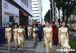 匯豐銀行10月21日舉行在臺二十周年慶暨信義分行開幕儀式,男女職員唐裝亮相,圖為女職員著旗袍走過位于臺北一0一大樓附近的信義分行新址。作者:張明新