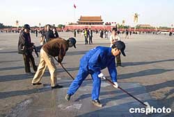 圖:北京天安門廣場地面清洗工作展開