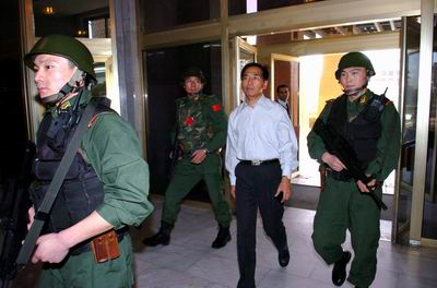 中國新任駐伊拉克大使楊洪林(右二)在武警戰(zhàn)士的護衛(wèi)下步入使館駐地--巴格達曼蘇爾飯店。楊洪林是伊戰(zhàn)后中國首任駐伊拉克大使。 新華社記者 申宏 攝