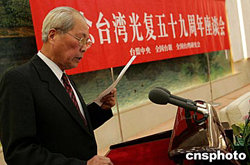 臺盟中央、全國臺聯、全國臺灣研究會十月二十五日在北京人民大會堂舉行座談會,紀念臺灣光復五十九周年。中新社記者:毛建軍