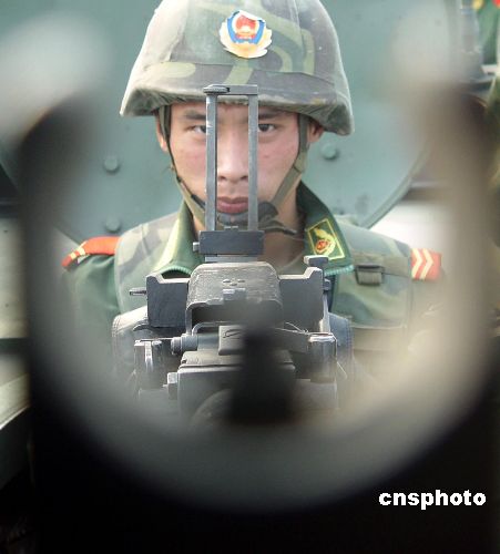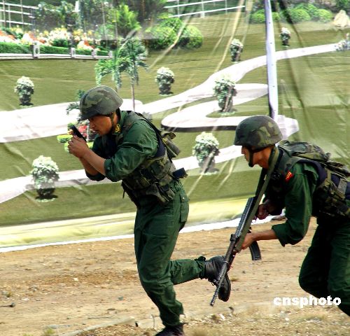 2004年10月25日,江蘇武警某部“反恐”分隊舉行“反恐”模擬演練,努力提高官兵在各種條件下處置突發事件能力。作者:王耀武