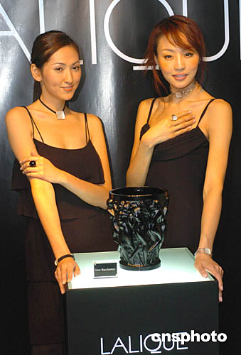 香港名模李嘉慧(左)、陳嘉容26日在香港中環演繹(LALIQUE)品牌水晶系列。中新社記者:趙振清