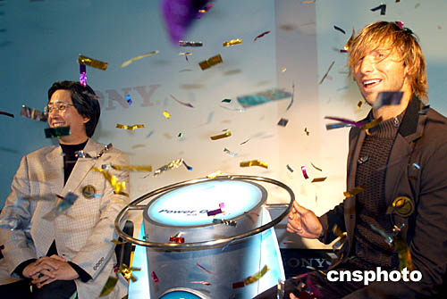 圖為索普(右)與索尼中國(guó)副總裁遲澤準(zhǔn)共同感受“激情,一觸即發(fā)”的美妙時(shí)刻。