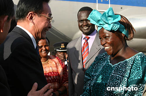 吳邦國委員長與到機場迎接的本年度諾貝爾和平獎獲得者旺加里·馬塔伊熱情握手交談,并向她表示祝賀。