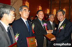 香港何梁何利基金十日下午在北京人民大會堂舉行二00四年度頒獎典禮暨基金成立十周年紀念大會,中國全國人大常委會副委員長許嘉璐(右一)出席并為獲獎人頒獎。該基金設立“科學與技術成就獎”和“科學與技術進步獎”兩個獎項,每年評獎一次,獎金分別為一百萬港元、二十萬港元,本年度共有四十九位中國內地科學家獲進步獎,成就獎空缺。作者:宗金柱
