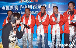 西藏登山隊(duì)明年將與奧維斯體育文化傳播公司繼續(xù)共同推進(jìn)“2004-2008地球第三極珠峰環(huán)保大行動(dòng)”,清理海拔6500米-8000米間的登山遺棄物。十一月十三日,合作雙方在北京秀水南街的一個(gè)西藏風(fēng)情餐吧舉行媒體見面會(huì),圖為登山隊(duì)隊(duì)長(zhǎng)桑珠(右五)、橫跨珠峰第一人次仁多吉(右四)、13高峰攀登者邊巴扎西(右三)、仁那(右一)及雪山之子洛則與公眾見面。中新社記者:鄒憲