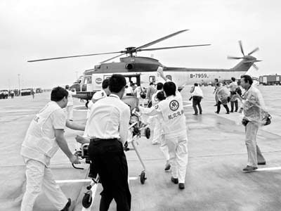 機(jī)場濃煙滾滾,兩輛消防車對準(zhǔn)飛機(jī)噴水,機(jī)組迅速打開艙門,施放緊急滑梯疏散旅客。機(jī)場醫(yī)療急救力量8輛救護(hù)車、60名擔(dān)架隊(duì)員也到達(dá)現(xiàn)場,醫(yī)療人員根據(jù)受傷輕重分別在場地上不同區(qū)域插上紅、黃、綠、黑、白五色旗,擔(dān)架隊(duì)員抬著擔(dān)架沖向失事飛機(jī)迅速將傷員轉(zhuǎn)離飛機(jī),送往臨時(shí)搭建的醫(yī)療驗(yàn)傷區(qū)。