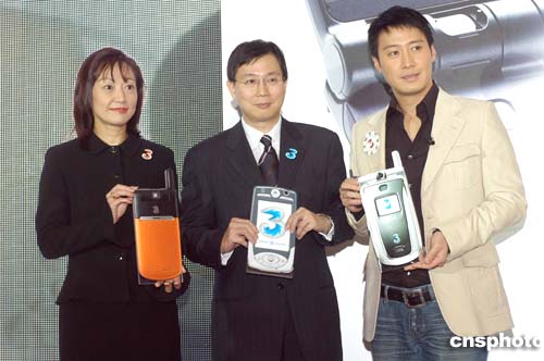 歌星黎明11月17日在香港出席和記電訊新型號3G視像手機推介記者會,和記電訊行政總裁呂博聞及3香港董事總經理李家慧與及歌星黎明于記者會上,共同推介三大型號3G視像手機將強勢登場。作者:鄧慶樂