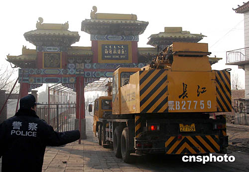 11月22日上午,緊急從包頭鋼鐵公司調來的重型吊車抵達空難事故地點——包頭南海公園,協助打撈11.21空難失事客機的殘骸。中新社記者:張宇
