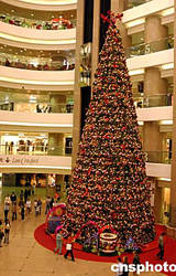 經濟持續向好,加上臨近圣誕節,香港大型商場均以大額宣傳費用,以增加人流,希望今年圣誕節業額有可觀收入。圖為時代廣場大堂裝飾紅紅火火的巨型圣誕樹,充滿圣誕氣氛。作者:譚達明