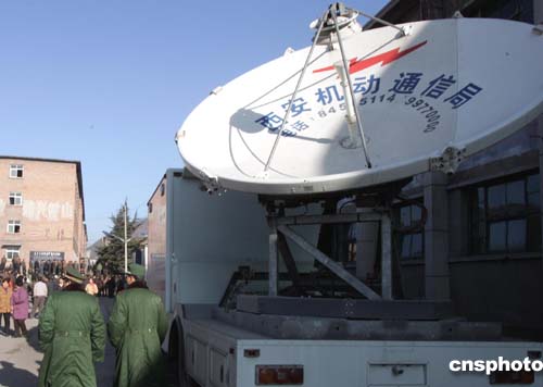 陜西銅川礦務局陳家山煤礦11月28日發生重大瓦斯爆炸事故后,中國各地媒體第一時間從四面八方蜂擁而至這個小山溝,各顯神通全方位報道事故的方方面面。圖為上海東方衛視以每日兩萬元人民幣的租價,從西安租用的衛星通訊車。作者:任晨鳴