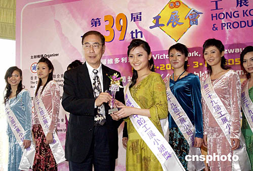 廠商聯(lián)合會(huì)會(huì)長(zhǎng)楊孫西向率先出爐的“傳媒眼中的工展小姐”麥鍶銘頒獎(jiǎng)。