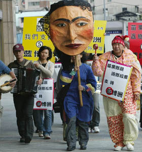 島內(nèi)知名導(dǎo)演侯孝賢9日在臺北車站打扮成小丑造型,呼吁苗栗鄉(xiāng)親返鄉(xiāng)投票。(臺“中央社”圖 作者:鄭杰文攝)