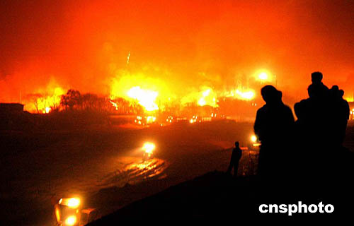 圖為爆炸發(fā)生時現(xiàn)場火光沖天,附近居民被緊急疏散到2公里以外。
